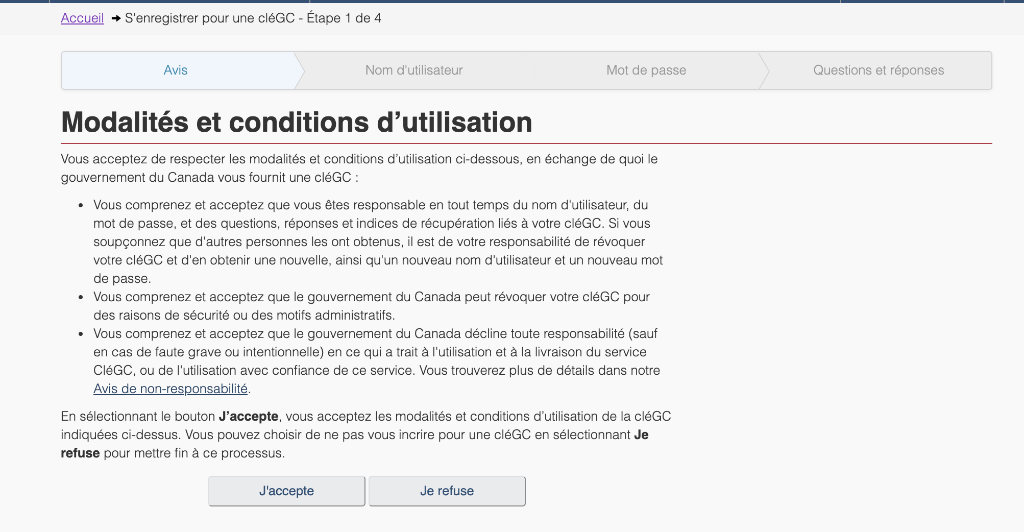Pour créer un nouveau compte, rendez-vous sur cette page, puis cliquez sur « Poursuivre vers la cléGC ». Cliquez ensuite sur « S’enregistrer ». Vous allez créer un nouveau compte, avec de nouvelles questions de sécurité, un nouveau nom d’utilisateur, un mot de passe. NOTEZ VOTRE MOT DE PASSE ET VOTRE NOM D’UTILISATEUR. Envoyez-le vous par e-mail par exemple sur une boîte un peu sécurisée.