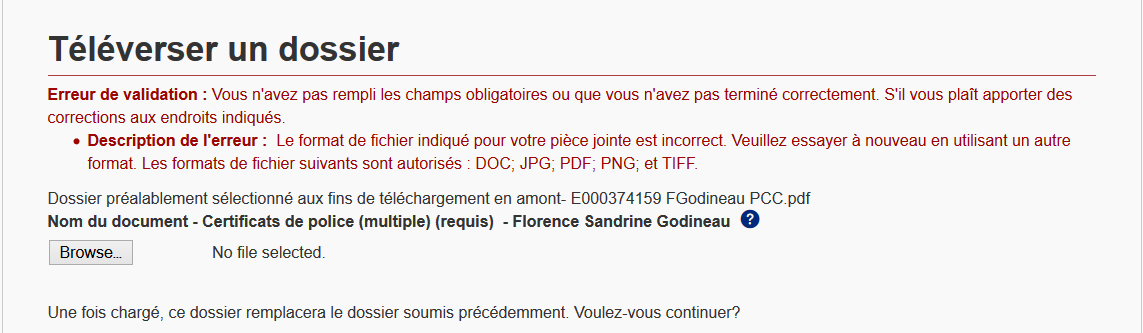 Pour info, dans la liste des documents à fournir, tous mes emplois étaient affichés, mais suite à la maintenance du site samedi dernier, seul l'emploi qui me donne des points doit être justifié par une lettre de référence. Comme j'ai déjà toutes les lettres de référence, je les joindrai sûrement dans les documents optionnels. Au cas où ce serait un bug. Ce ne serait pas la seul cette semaine: impossibilité de charger des fichiers de plus de 2 Mo (alors que la limite est de 5 Mo normalement) et erreurs sur les formulaires qui étaient bien remplis la semaine dernière.