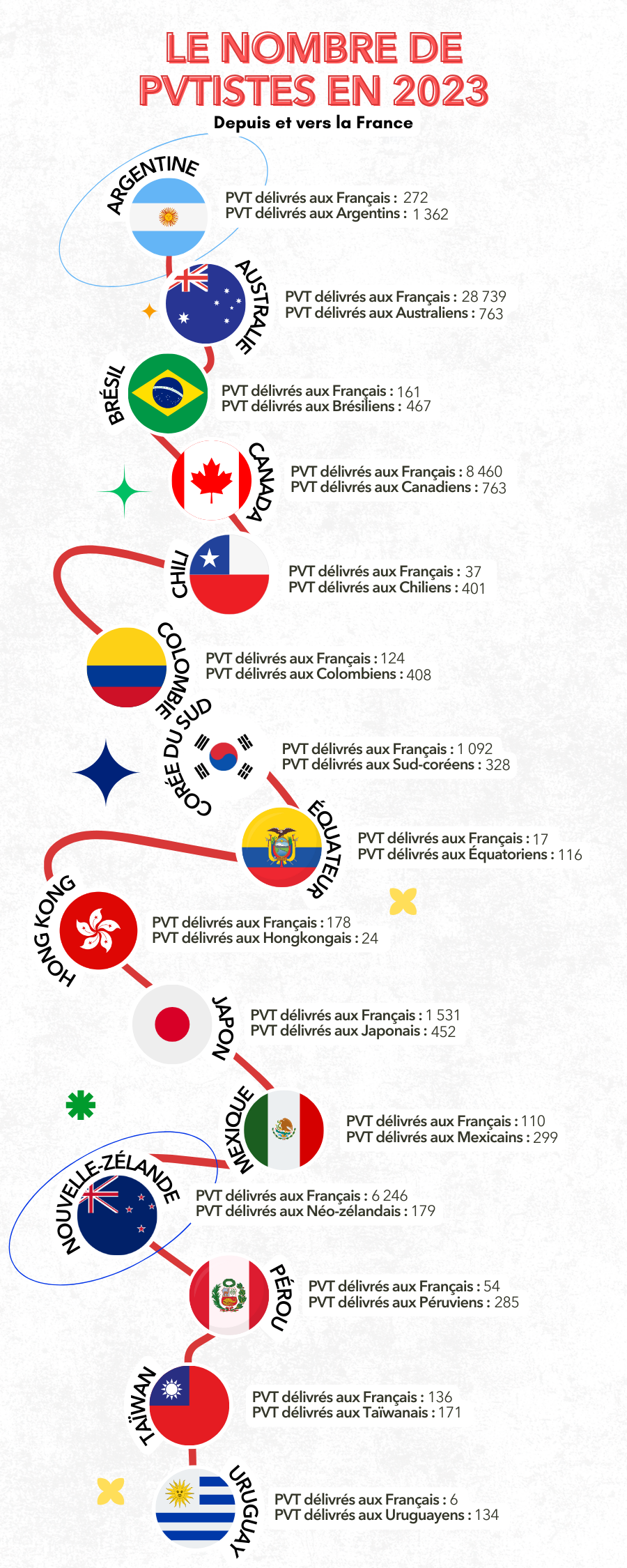 Voici une infographie qui détaille les statistiques 2023 du Programme Vacances-Travail (depuis et vers la France), communiquées par le ministère de l’Europe et des Affaires étrangères.