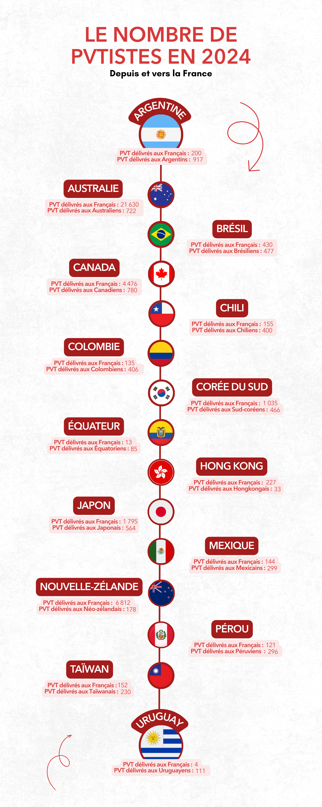 Cette année, on compte 37 329 pvtistes français (soit une baisse d’environ 10 000 personnes par rapport à 2023 !) et 5 964 jeunes venus en France en PVT.