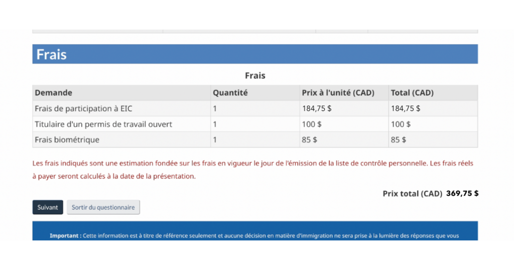 Les candidats au PVT doivent payer 369,75 $CA de frais : 184,75 $ de frais de participation à EIC, 100 $ de frais pour les titulaires d’un permis de travail ouvert et 85 $ de frais biométriques (pour le prélèvement de vos données biométriques).