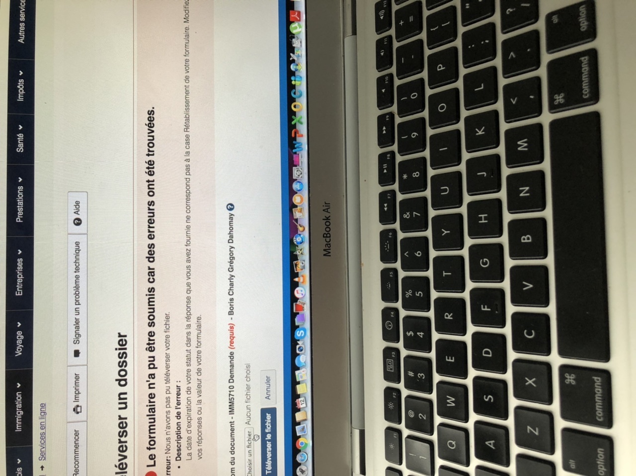 je suis confronté à un nouveau problème, je suis en train de remplir ma demande de prolongation de permis de travail pour mon pvt qui se termine le 30 juin 2020, j’ai tout réussi à téléverser mise à part l’IMM5710 ou ça me met un message d’erreur: « la date d’expiration de votre statut dans la réponse que vous avez fournie ne correspond pas à la case rétablissement de votre formulaire. Modifiez vos réponses ou la valeur de votre formulaire. » Je vous mets une image pour illustrer mes propos en espérant qu’un membre est déjà passé par là et pourras m’aider à trouver une solution. Merci