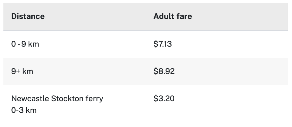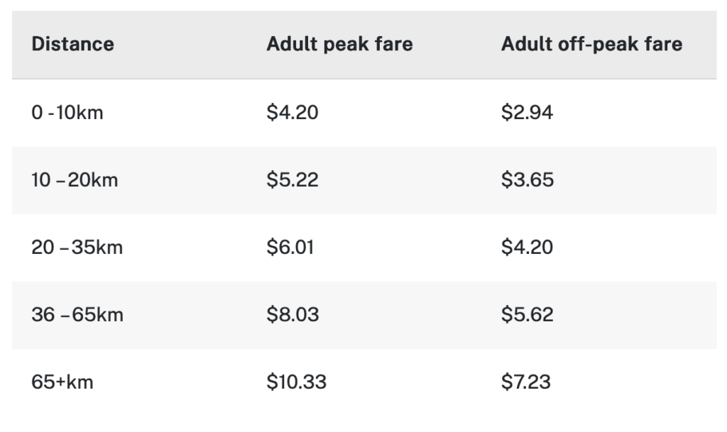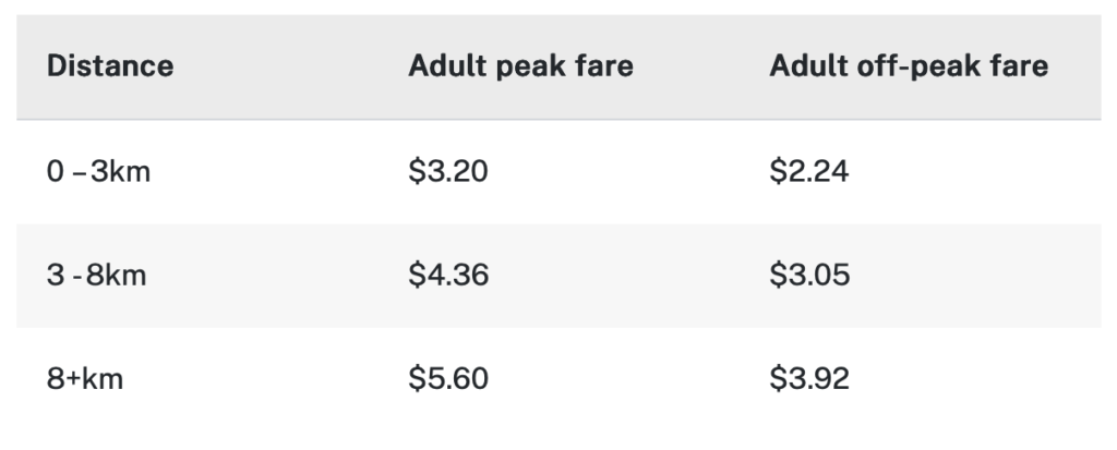 Voici les tarifs pour des trajets en métro ou en train dans la ville de Sydney. Comme vous pouvez le voir, les prix fluctuent selon la distance, l’heure et le type de trajet sélectionné.
