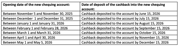 - You need to keep the new chequing account for at least 12 months starting when the chequing account is opened. If you don’t meet this condition, you’ll have to reimburse a portion of the cashback for the product you didn’t maintain corresponding to the period still remaining.