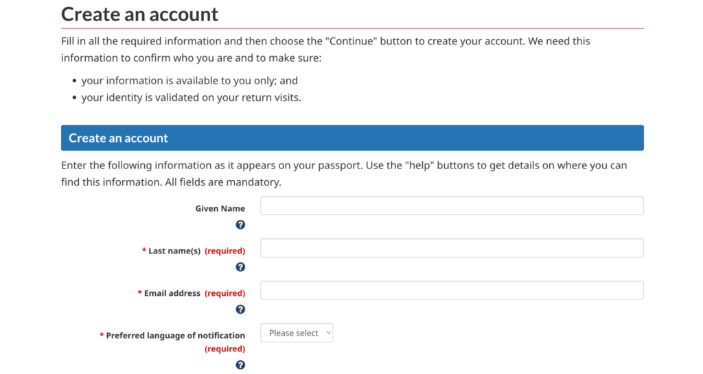 The first page will ask you to add your names (as they appear in your passport), email address, and preferred language of contact (English or French):