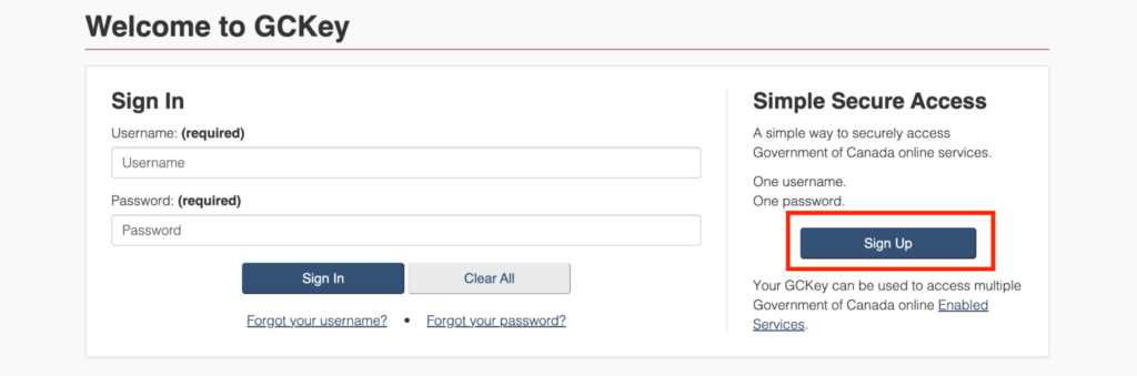 Choose the option to register with GCKey, then click “Sign up”: