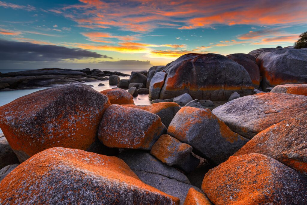 The Bay of Fires lines the northeast coast of Tasmania. Though the unique characteristic of this region is the orange lichen rocks, the bay’s name actually comes from an English navigator in the 1700s, who saw burning fires lit by the island’s Aboriginal population as he passed by the coast. The main activities in the Bay of Fires are coastal walks, beaches, ocean cruises, and mountain biking.