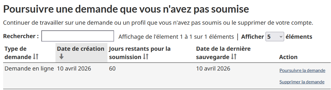 Cependant, en me connectant à mon compte IRCC, je constate qu’une demande apparaît dans la section « Poursuivre une demande que vous n’avez pas soumise » (type de demande : demande en ligne).