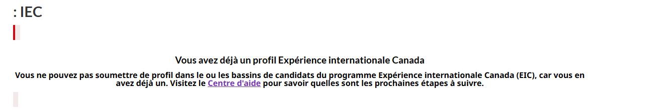 Bonjour à tous! lors de mon inscription Pour le EIC Canada j'ai un message d'erreur qui apparait.Vous avez déjà un profil Expérience internationale Canada