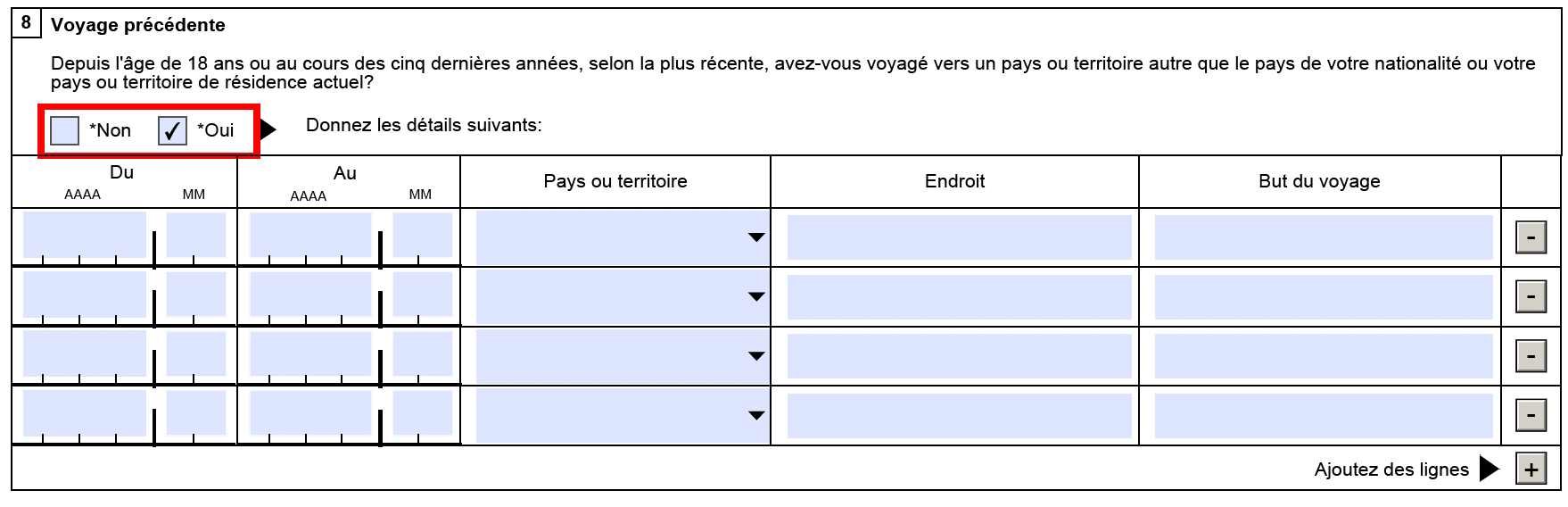 • Aussi, ils m'ont transmis le document "imm5257_1f" afin de répondre à leur demande et là-dessus, il y a une section "Voyage précédents" où ils demandent où j'ai été "les cinq dernières années", et non il y a 16 ans, du coup est-ce que je devrais tout de même remplir cette section avec les destinations d'il y a 16 ans, malgré l'intitulé de la section ? (voir la pièce jointe)
