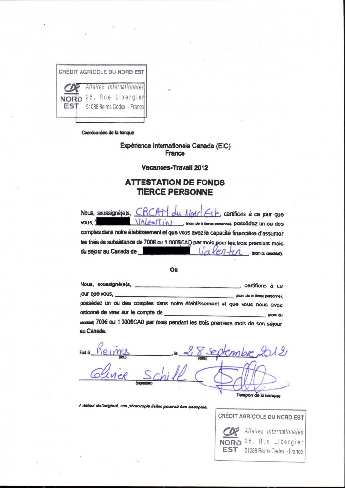 Nous soussigné, XXXXX, certifions à ce jour que vous XXXXXX (nom du candidat), possédez un ou des comptes dans notre établissement et que ceux-ci présentent une somme égale ou supérieur à 2100€ ou 3000$CAD