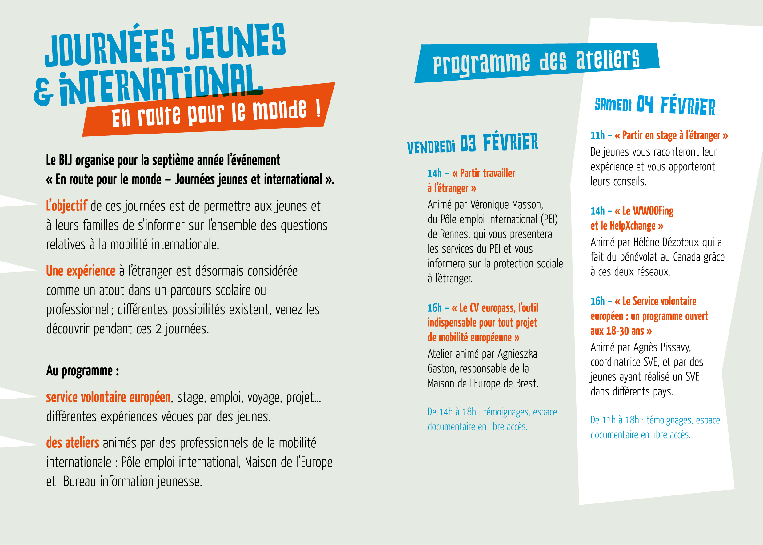 Les 3 et 4 février prochains, le Bureau International Jeunesse (BIJ) de Brest organise deux journées Jeunes et International. Au programme, des informations sur le SVE, le Wwoofing et HelpX (merci à Hélène, une des VIP du forum !), le volontariat, des témoignages de jeunes partis et la présence du Pôle Emploi International.