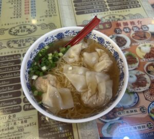 C’est une soupe de nouilles servies avec des wonton (des petits raviolis de crevettes) et quelques légumes verts comme du pak choi.