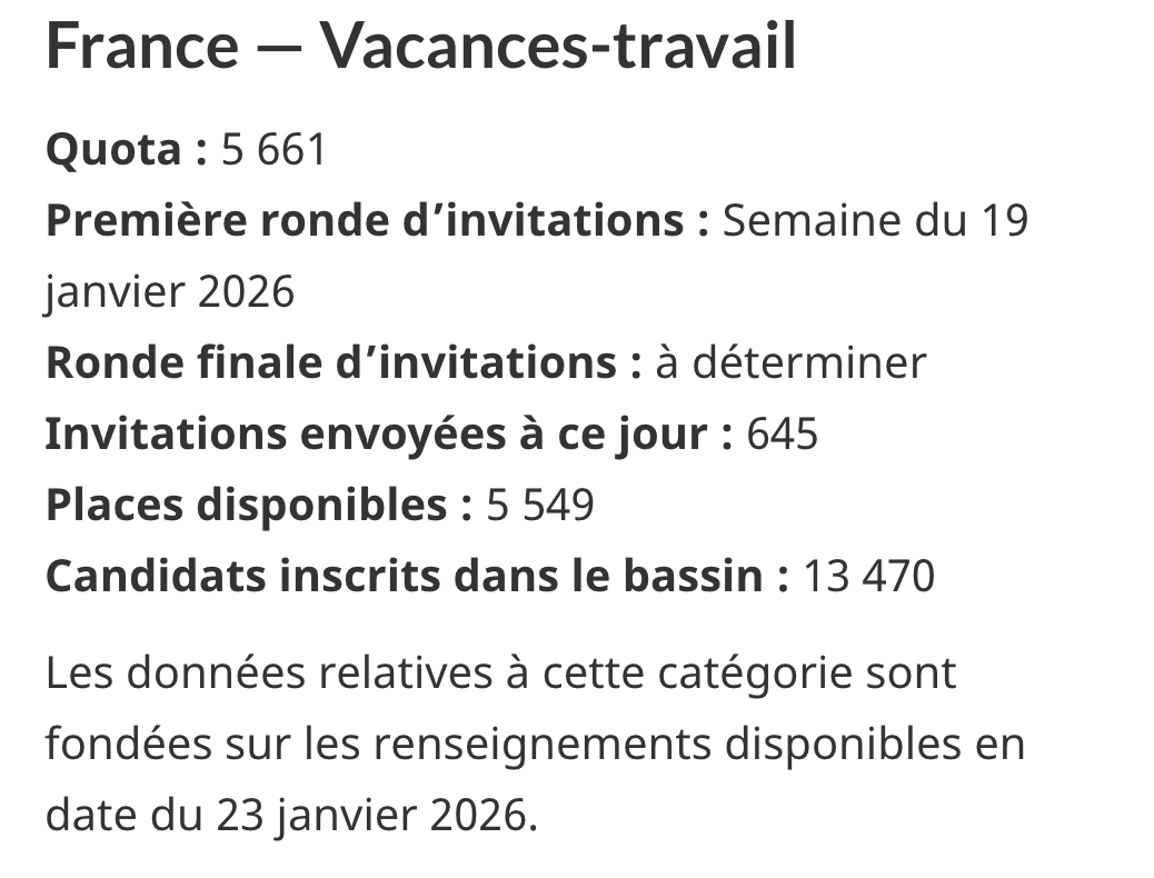 - Quota : 6 615 places disponibles pour les Français en 2025. - Invitations envoyées : ce chiffre n'indique pas le nombre de PVT délivrés. Beaucoup de candidats ne voient pas ou refusent leur invitation. - Places disponibles : ce chiffre est une estimation des places restantes, prenant en compte les invitations expirées ou refusées. - Candidats dans le bassin : ce sont ceux qui n'ont pas encore été invités. Si vous avez refusé une invitation ou n'avez pas réagi, vous pouvez être réinvité. Pour en savoir plus, lis l'article complet pour tout savoir de la saison PVT Canada 2025.Lire la suite