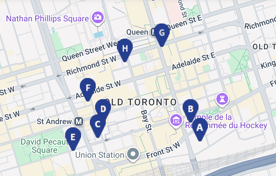 Si on prend l’exemple du centre-ville de Toronto, voici ce que vous voyez à l’écran (pour chaque lettre, vous avez ensuite l’adresse exacte du guichet) :